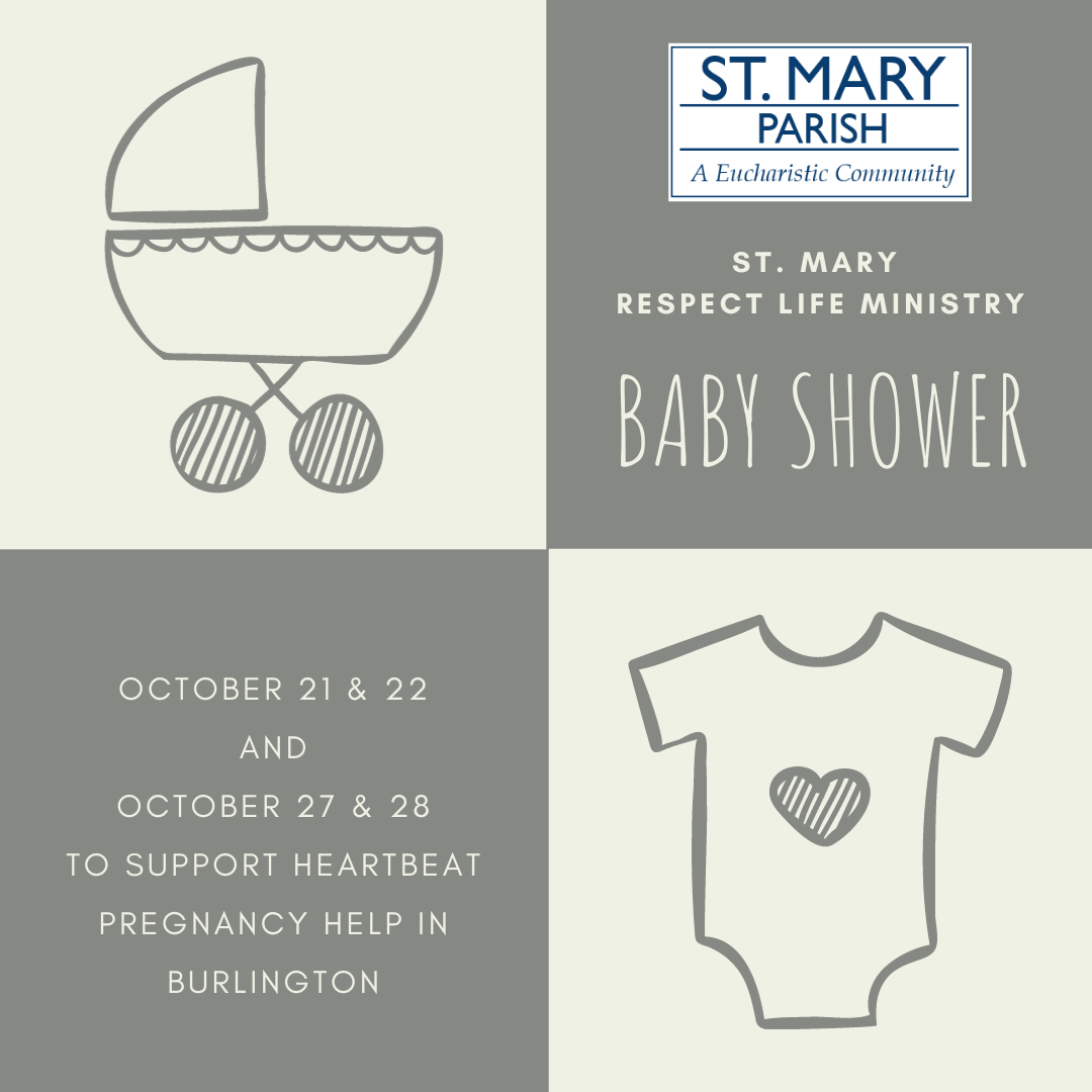 Please join St. Mary's Parish in supporting the work of Heartbeat Pregnancy Help in Burlington. We are accepting baby items including: baby towels, diapers, new clothing, and homemade items as well as cash donations. There will be a portable crib at the back of the church on the published weekends and volunteers to accept your donations.
